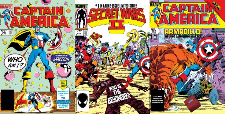 These two issues of Captain America launch Mark Gruenwald’s decade of writing the book, much of which sits among the very best Cap stories, but it gets off to a slow start: The first issue deals mainly with Cap’s crime-fighting partner Nomad, and the second had to tie in with Secret Wars II, the first issue of which fits in between the other issues covered here.