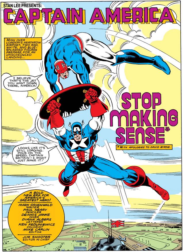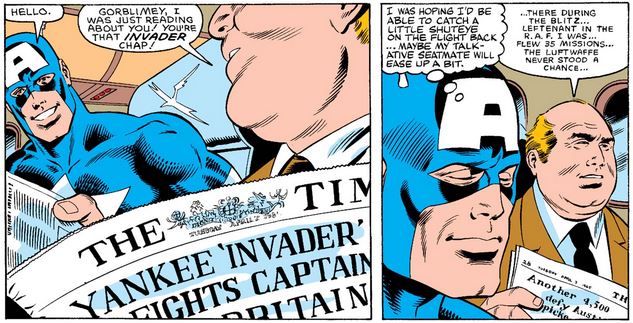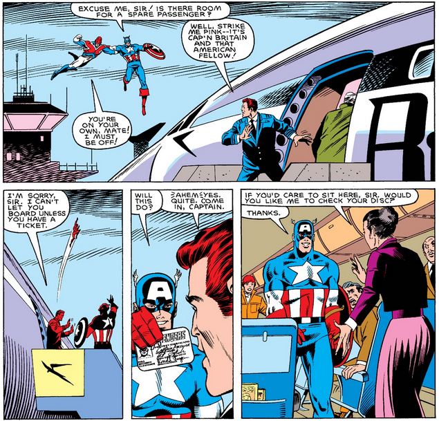 Following their adventure together in the previous two issues, Captain Britain does Captain America a solid as Captain America #307 opens, literally dropping him off at the airport.
