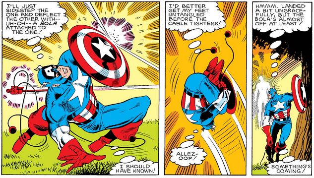 We get our clue as to where Cap is when arrows start flying at him, some with curious attachments…