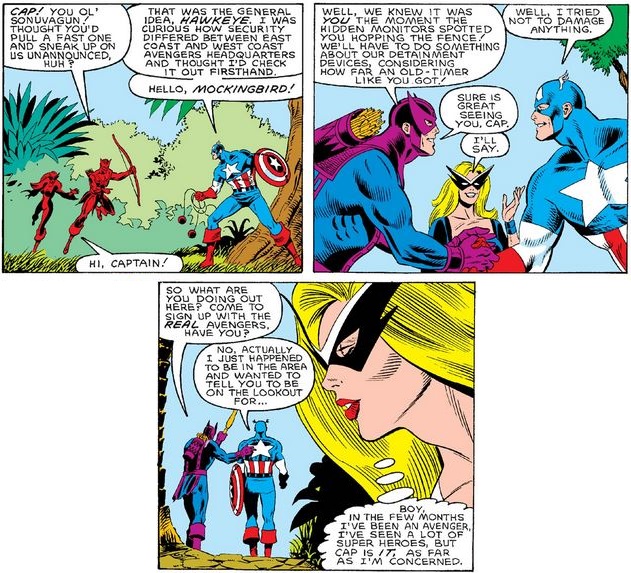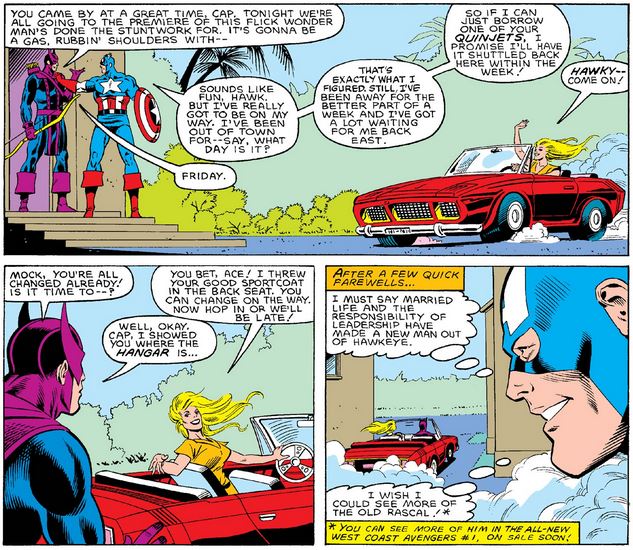 In addition to securing transportation back east, Cap confirms what day it is, and reiterates the thought he had in Avengers #242 upon learning of Clint and Bobbie’s marriage.