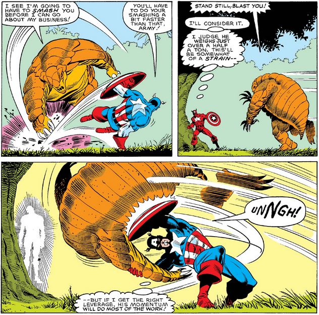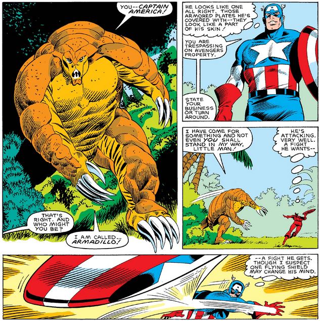 After fighting some more, Cap tricks Armadillo—I’m not calling him “Army”—into a pit trap, at which point the captive intruder explains that he has to complete a mission for Dr. Karl Malus, the man who has promised to save his wife from a mysterious fatal illness and who also transformed him into a human armadillo. (I wonder if insurance covered either.)