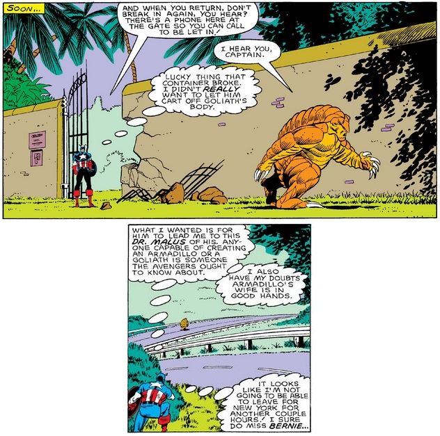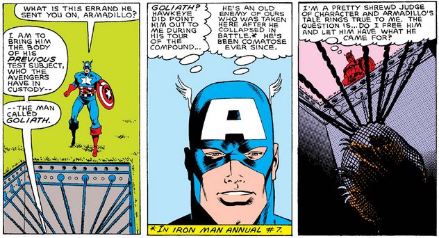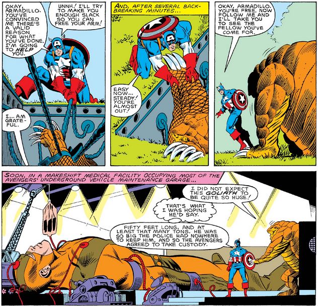 Armadillo planned to use Pym particles to shrink Goliath and take him back to Malus, but they “evaporated” (huh?), so Cap tells him to ask for more and then come back and ask the West Coast Avengers nicely if he can have Goliath. (Don’t worry—he didn’t really mean it.)