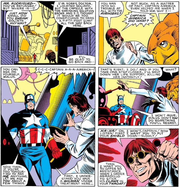 When Armadillo return to Dr. Malus, he is completely open about his experiences with Captain America; to me he sounds proud, like telling his dad that the cool kids let him play ball with them. And he seems just as honestly surprised that Malus turns on him and his wife when Cap threatens him. (Armadillo seems very childlike, which explains why Cap’s ploy above seems a little manipulative to me.)