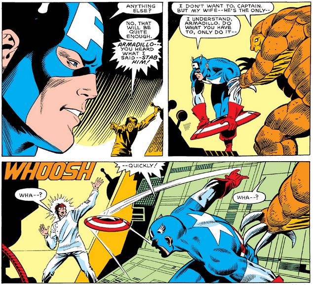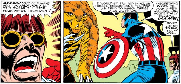 Malus once again orders Armadillo to attack, and this time Cap counters by pointing out the danger to Armadillo’s wife if he does, appealing to the same concerns that compel him to fight Cap.