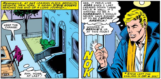 After three pages reintroducing Madcap, the stripey fella on the cover who fought Nomad in issue #307, we finally meet up with Steve Rogers, tipping his cabbie well and hoping his honey is home, while silently excusing himself for being away so long.