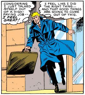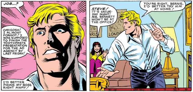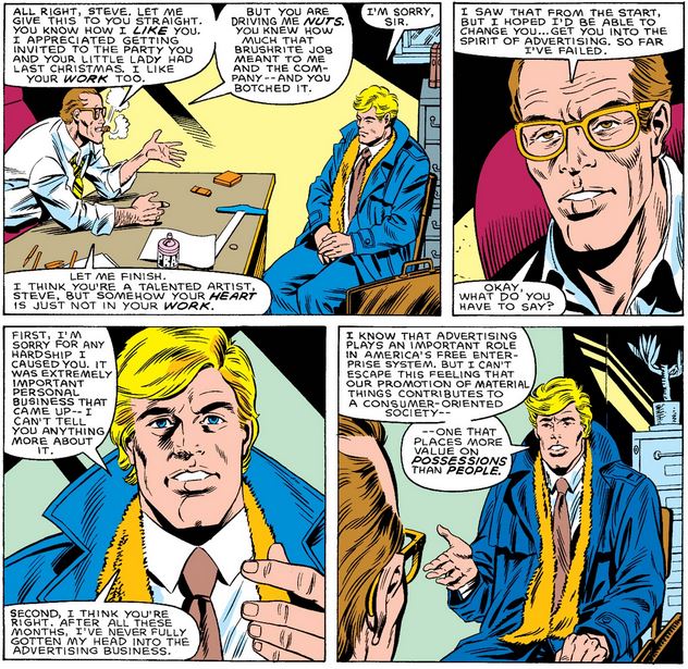 Come Monday morning, commercial artist Steve Rogers is in his boss’s office, apologizing for flaking on his last assignment and copping to his discomfort doing illustrations for advertisements, reiterating arguments against consumerism that he made in issue #292.