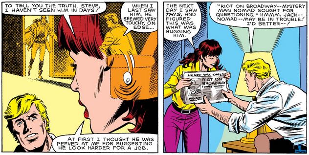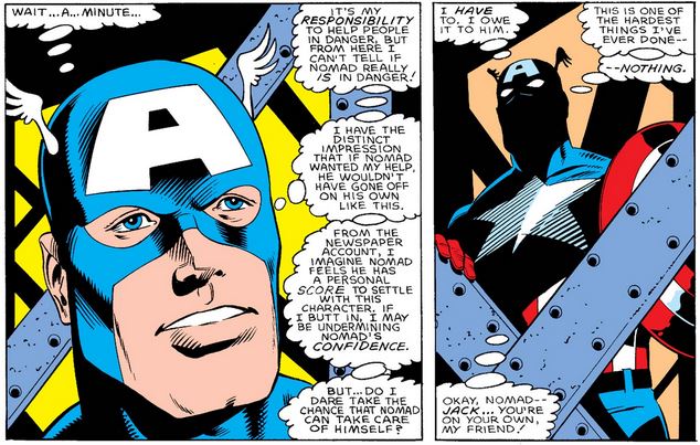It might just be Bernie’s voice in his head, but Cap thinks through the matter of helping Nomad, weighing his general responsibility to help people with his specific responsibility to let Jack handle his own problems, and decides to hang back. (Note the deep shadows when he dramatically admits he has to do… nothing. Oh, poor Cap.)