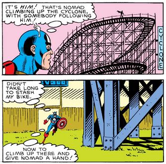 After Jarvis mentioned that Nomad stopped by asking where a lunatic (such as Madcap) would be found—why would he think Jarvis would know that?—Cap heads to Coney Island, where the two are locked in battle.