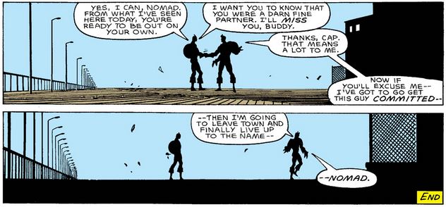 After Nomad takes care of Madcap—a man who has embraced the absurdity and meaningless of life as described by the existentialists, but chooses the nihilistic path of “nothing matters” rather than the responsibility to create your own authentic meaning and purpose—he discovers Cap was there the entire time, and takes the perfect opportunity to announce he’s leaving the act to record his solo album.