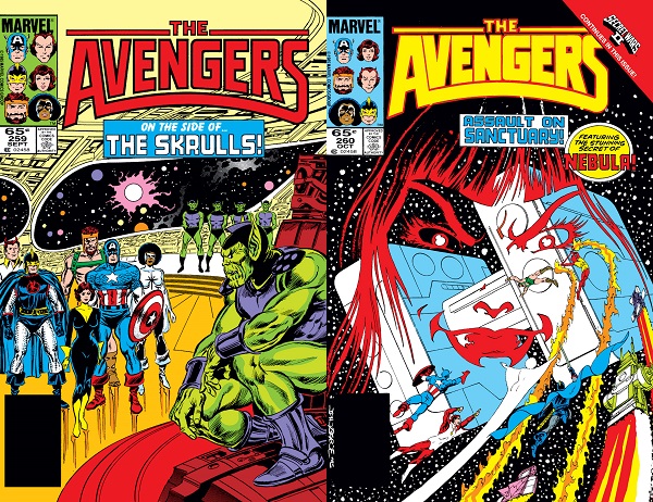 In the end, the Beyonder shows up—this issue is a Secret Wars II tie-in, after all—and disposes of Nebula and her lackeys, leaving the Avengers to have another adventure with the Skrulls in Avengers Annual #14, covered in the next post.