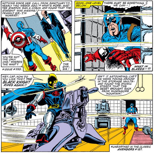 Here begins the search for Captain Marvel, at which point Captain America starts to collect the team, finding the Wasp and Black Knight playing with an overgrown mechanized horsie-ride like the ones that were the highlight of many a grocery store trip when we were kids.