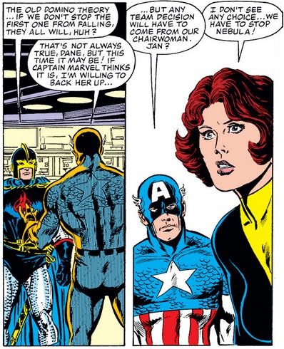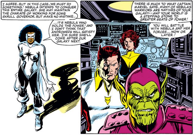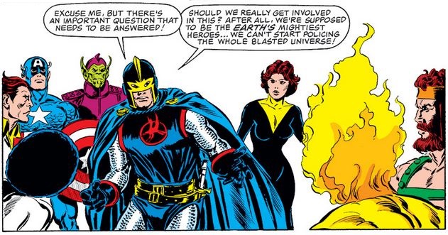 At Captain Marvel’s urging, the Avengers meet with the Skrulls and are called to help them fight the threat of Nebula, who claims to be the granddaughter of Thanos. Even though Cap isn’t involved, the ensuing discussion over jurisdiction is interesting, with the Black Knight starting off with an appeal to the team’s limited resources and the need for them to protect the Earth, not interests in space, Skrull or otherwise.