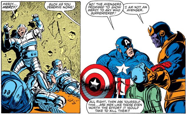 …but Cap nonetheless stands up to the Mad Titan when he wants to execute war prisoners, and when a principled appeal doesn’t work, he tries a more pragmatic one, although it is hardly logic that Cap would accept himself.