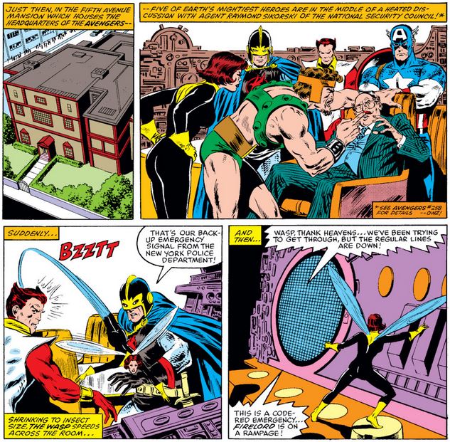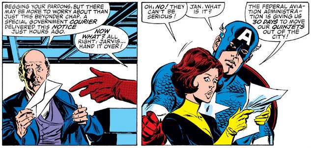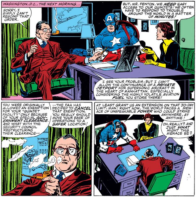 So Cap and the Wasp have to go to Washington and meet with the Federal Aviation Administration, who have fallen in line with the United States government’s current disfavor with the Avengers (since issue #255). Cap tries to explain the global emergency the Beyonder currently presents…