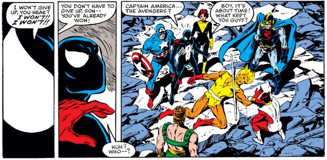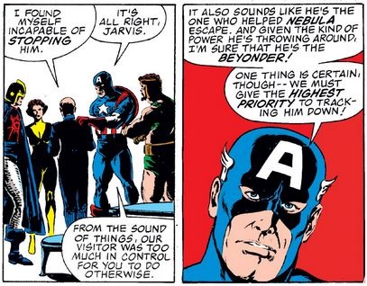 After toying more with Cap and Wasp, and then with Hercules and the Black Knight, the Beyonder appears in front of the collected Avengers (now including Captain Marvel), claiming that he just wants to help. So Janet makes him a surprising offer (and Cap gives her the benefit of the doubt about it).