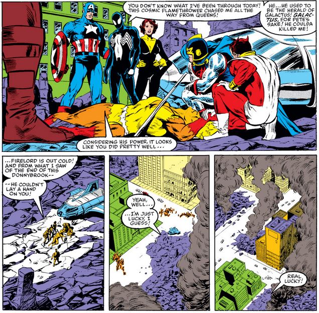 Finally, in Amazing Spider-Man #270 we finally see the battle between Spider-Man and Firelord that preceded the scene below, based on Avengers #258.