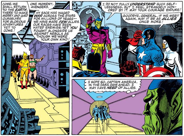 In Avengers #261, the team celebrates their recent victories with the Skrulls and prepare to return to Earth, with Cap paying respect to the Skrull general, signifying the possibility of a new relationship between Skrulls and humans.