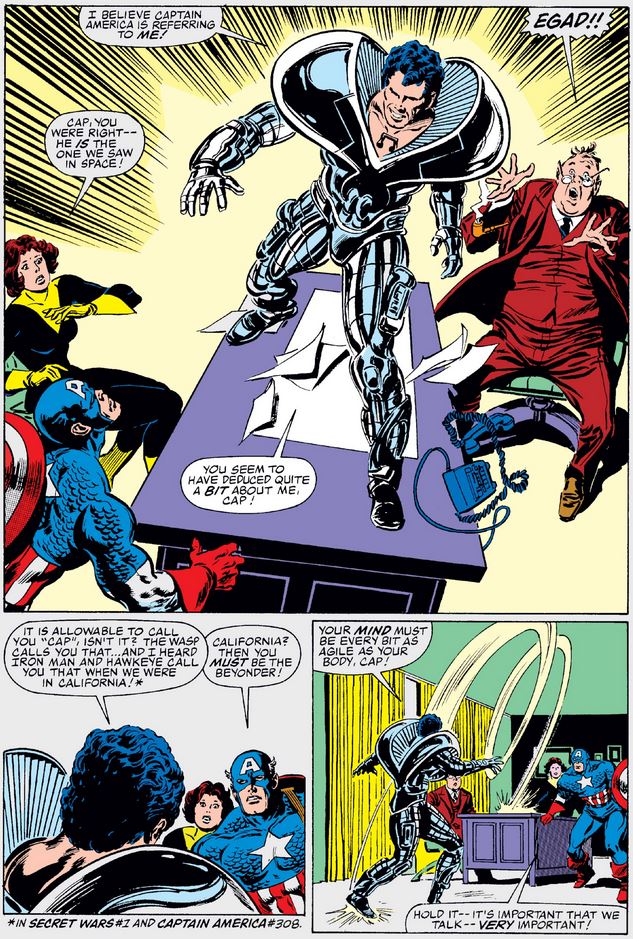 Keep in mind that this is the first time Cap and the Wasp have seen the Beyonder, who remained behind the scenes in the original Secret Wars series, adopting human form only when he came in Earth for the sequel, going through several forms before settling on Cap himself, with a later hairstyle change (in Secret Wars II #3) to look like superstar Mac Davis.