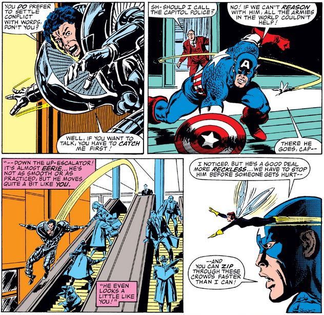 The Beyonder tells Cap and the Wasp that they’re “it” and takes off, and the way he glides down the escalator rail reminds Janet of Cap (who would never ever do such a thing).