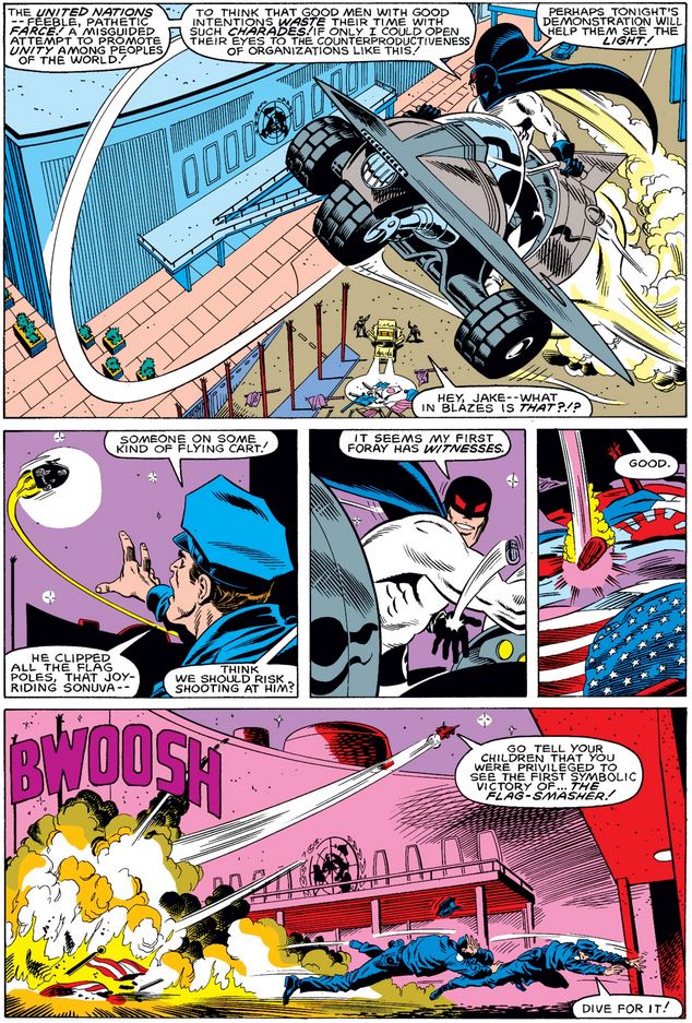 The issue opens with Flag-Smasher attacking the United Nations building and giving a hint of his worldview, which will be expanded on later in the issue. (Hint: Even though he destroys an American flag in the page below, he’s not anti-American in a simplistic sense, as suggested by his comments about the U.N. as a whole and the fact that he cut all the nations’ flags down.)