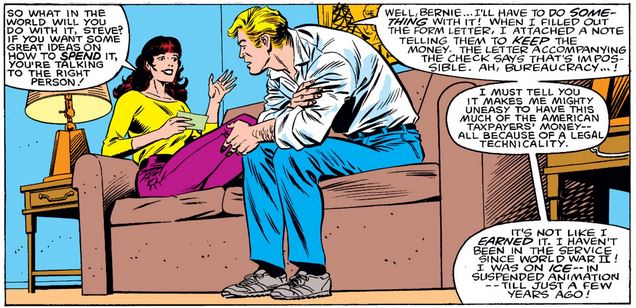 More about him later… let’s turn to our favorite couple, enjoying a quiet morning that turns surprisingly eventful, starting with a confirmation of Bernie’s future career path, first mentioned in the last issue. (She might even defend a Captain America one day.)