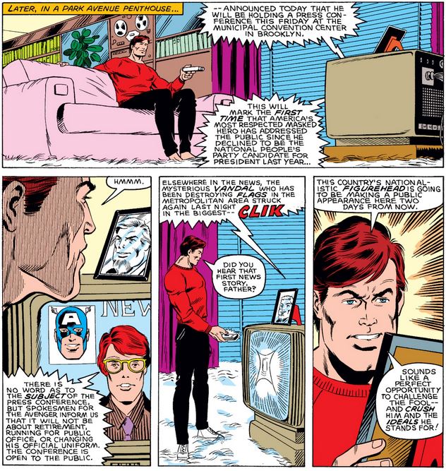 Cap’s pose on the couch is paralleled in the next panel, featuring Flag-Smasher—real name Karl Morgenthou—out of costume.