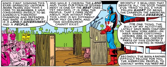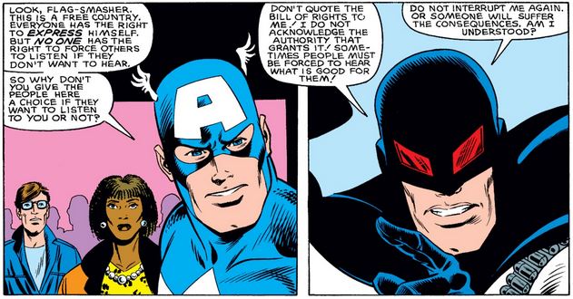 Cap gives a lesson on the First Amendment that many always seem to need to hear: that it guarantees the right to speak but not the right to be heard (nor to have one’s speech printed or broadcast by others). But it seems to be wasted on Flag-Smasher, who doesn’t recognize the authority of the Constitution—or, presumably, any other laws validated under it, which is not very surprising.