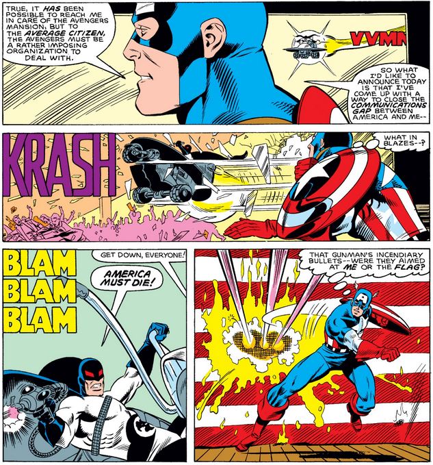 Wonderful stuff. The first of many great issues in Gruenwald’s deservedly legendary run. I love the way he makes this story, and so many that follow, a sort of moral/philosophical procedural of how Cap deals with dilemmas great and small.