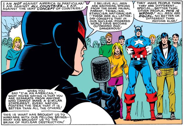 Cap could have easily provided counterarguments—for instance, that extreme nationalism is not the only kind, and that Cap’s own conception of patriotism is moderate, accommodating, and cosmopolitan, taking pride in one’s own country and nationality while respecting others as well, as I explain in chapter 6 of my book. But instead, perhaps due to the urgency of the situation, Cap takes issue with Flag-Smasher’s method of getting his point across, which was wrong in themselves, beside defeating his own argument for peace and unity among the peoples of the world.