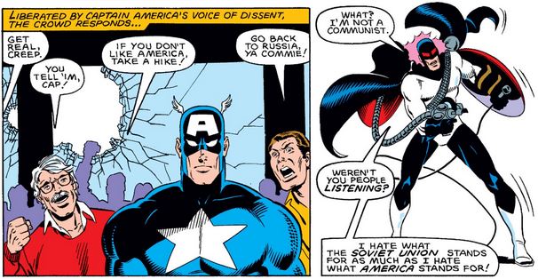 The crowd stands behind Cap, but I’m not really sure they understood what either he or Flag-Smasher said, resorting to “love it or leave it” rhetoric and ignorant name-calling.