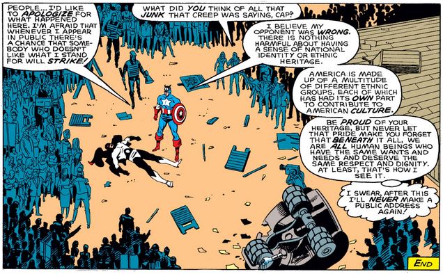 Even with the continued support of the crowd, Cap regrets the fact that so many were in danger. After apologizing for this, he addresses Flag-Smasher’s arguments themselves, making a point similar to the one I suggested above: One can be proud of their country and its traditions without denying the validity of others, or the equal dignity of all persons everywhere. (He also draws ethnic heritage into it, making the same point about appreciating your own while respecting others, in response to Flag-Smasher’s larger point about eliminating all differences between people.)