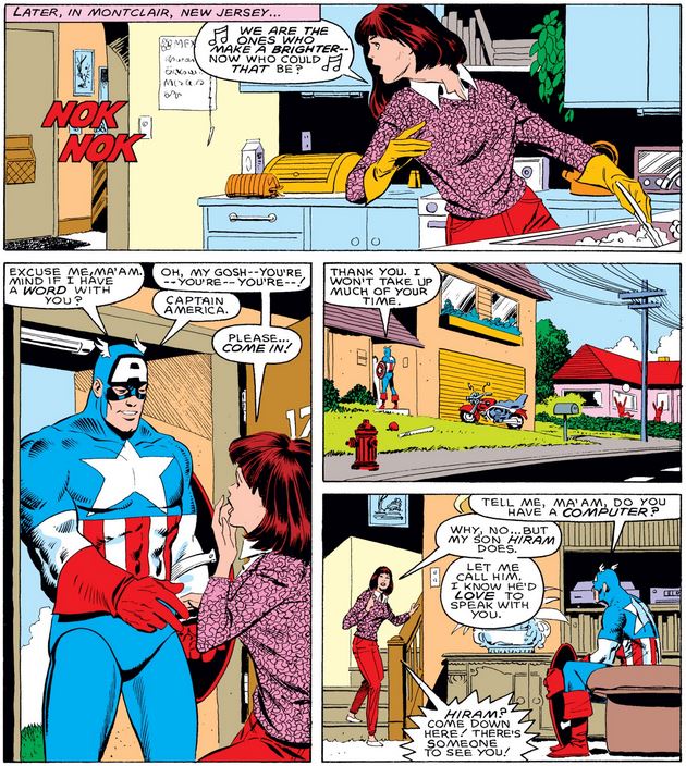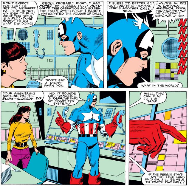 Afterwards, Cap gives his #1 fan in New Jersey (at the time) a personal update on his adventure, and then suggests a way to solve his hotline problems and stop Hiram and his pals from hacking his system.