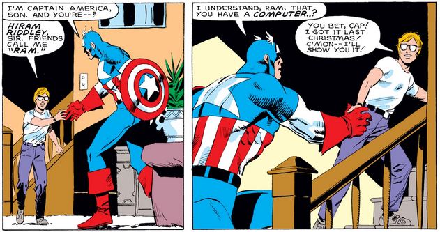 We learn what a modem is before Cap starts to lecture Hiram on what he and his fellow computer enthusiasts did wrong… but sorry, I got stuck on the idea of what Cap’s password is. Possibilities: AVENGERSASSEMBLE, IMISSTHE1940S, or TONYSUCHALOSER. (Get together with your friends and make up your own!)