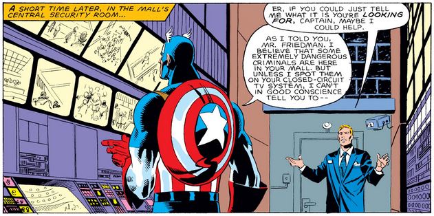 Cap visits the nerve center of the Newbury Mall, where Mr. Friedman is obviously the Marvel Universe version of Ozymandias from Watchmen.