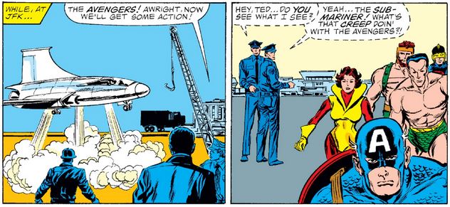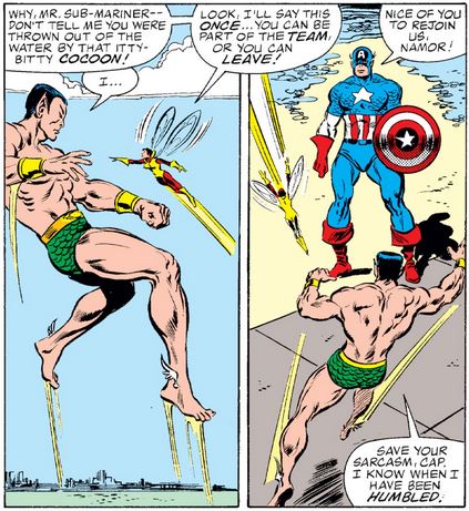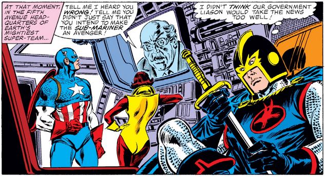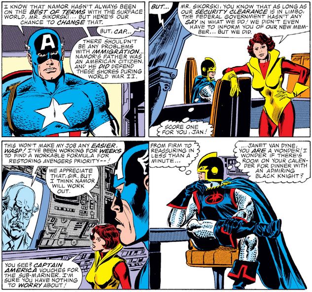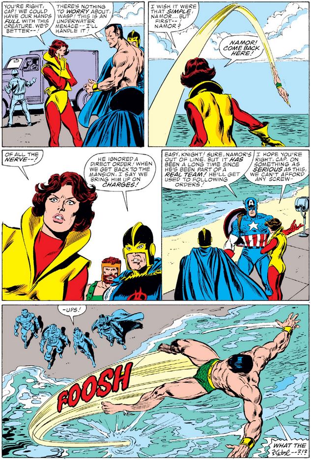 Cap argues the benefits of improving relations with the monarch of an undersea kingdom, and vouches for his eligibility on legal grounds, while the Wasp takes a more defiant approach before deferring to Cap’s reputation. (The Black Knight is impressed with his team leader all the same.)