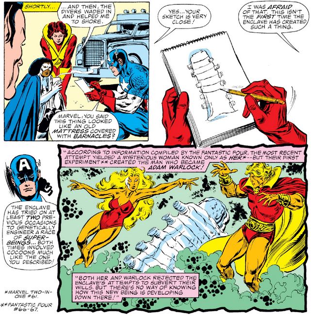 Of course, one of the team has a certain affinity for the water, and takes it upon himself to check things out, against the wishes of leadership. Black Knight has the Wasp’s back, of course, but Cap once again defends his fellow former Invader.