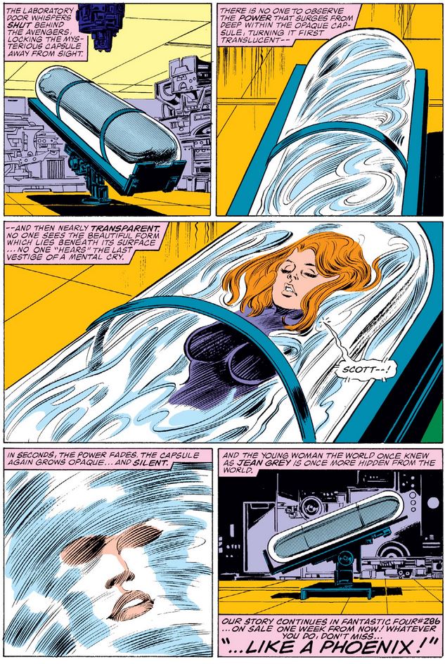 Most of the rest of the issue is a looong “explanation” of how, years ago, the Phoenix Force took Jean’s place, rather then possessing her, so it wasn’t Jean who sacrificed herself at the end of “The Dark Phoenix Saga” (an act I wrote about in my chapter in X-Men and Philosophy, edited by Rebecca Housel and J. Jeremy Wisnewski). Instead, Jean remained in suspended animation, recovering from the incident during which the Phoenix took her place, until re-emerging this very issue.