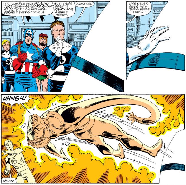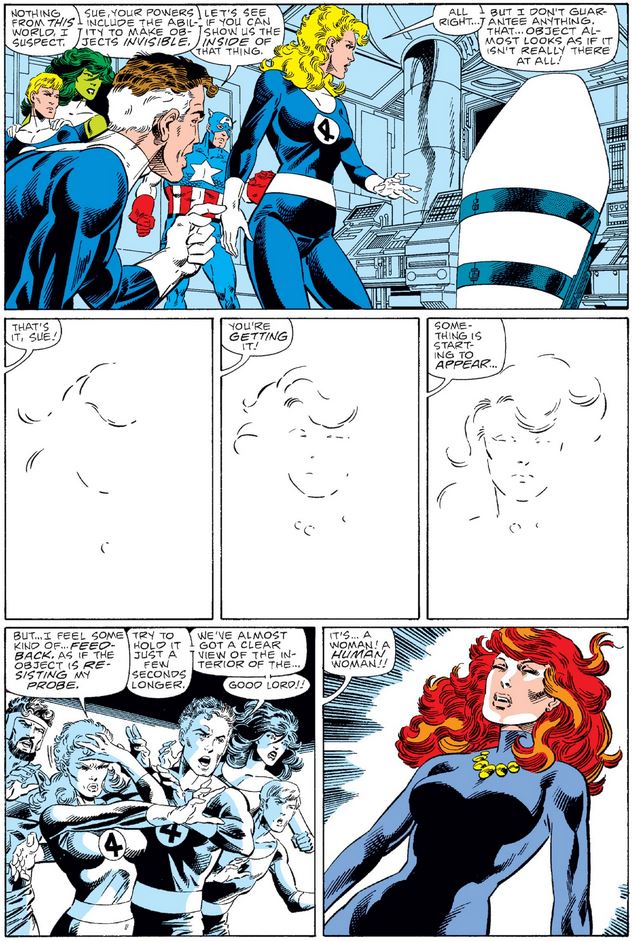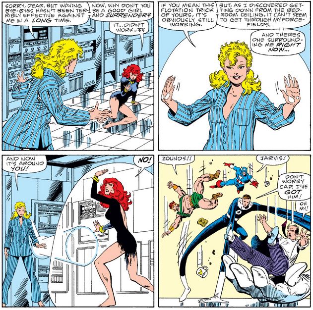 Again, it’s Sue to the rescue, using her forcefield to cut off Jean’s powers… but without warning the boys first. (Of course, Cap is only concerned about Jarvis, especially after Reed filed a complaint with the labor authorities.)