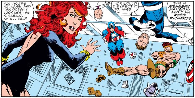 Unfortunately, she’s as confused and disoriented as everyone else—although the fellas all seem to be taking the current zero-g environment in stride. (Cap and Hercules just look bored.)