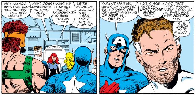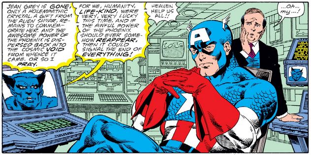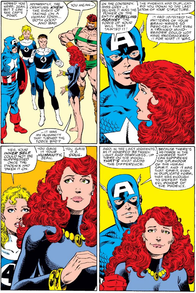 Reed feels left out, so he interjects, but Cap just keeps going like nobody else is there, telling Jean how her decency and heroism helped defeat the Phoenix from the inside.