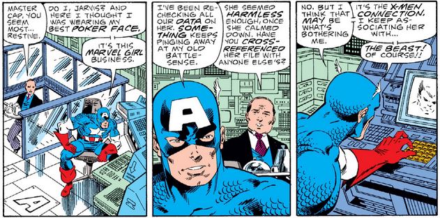 After several of the heroes take Jean to her parents’ house to try to get more answers, Cap uses the Avengers computers to look more clues and remembers another friend of the mutant persuasion, all while giving a young Ms. Germanotta an idea for a hit song.