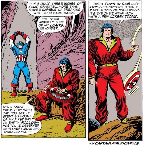 The Beyonder reminds Cap of how he copied his physical form in Captain America #308 while he fiddles with the shield, apparently unimpressed with its miraculous properties.