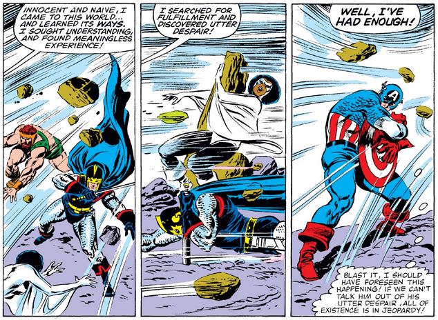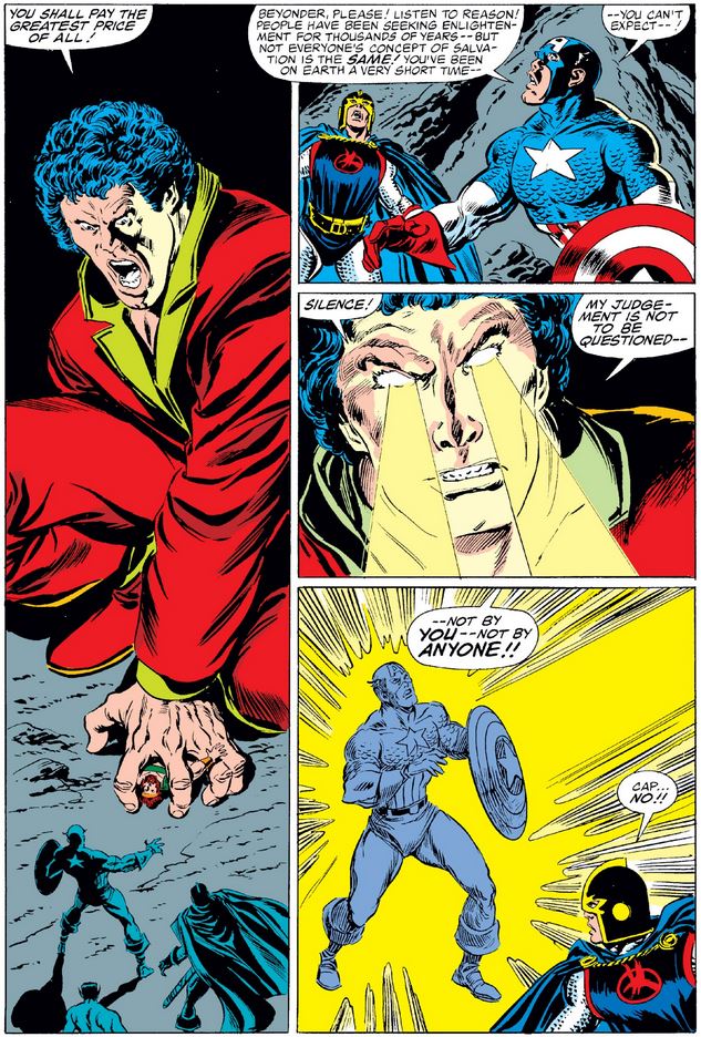 I don’t know if Cap’s sleep science holds up—and even if it did, how does he know he wouldn’t knock the Beyonder into a dream state—but the question is moot because the Beyonder was just pretending, ha! But he does give Cap his due…