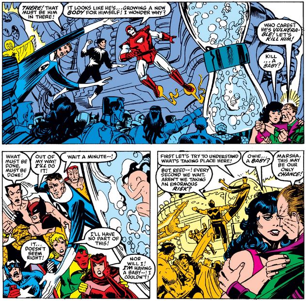 Meanwhile, the Beyonder has been quite busy himself, making himself mortal and then a god again, until he tries to achieve humanity and omnipotence at the same time, starting as an infant in a gestation tank, which raises the classic “baby Hitler” conundrum. On this issue, it may seem that Cap is surprisingly uncommitted, until you realize the monumentally enormous stakes involved, which could threaten even the strongest principled stand. (This is consistent with threshold deontology, discussed in chapter 5 of my book and in more detail in this article by legal philosopher Larry Alexander.)