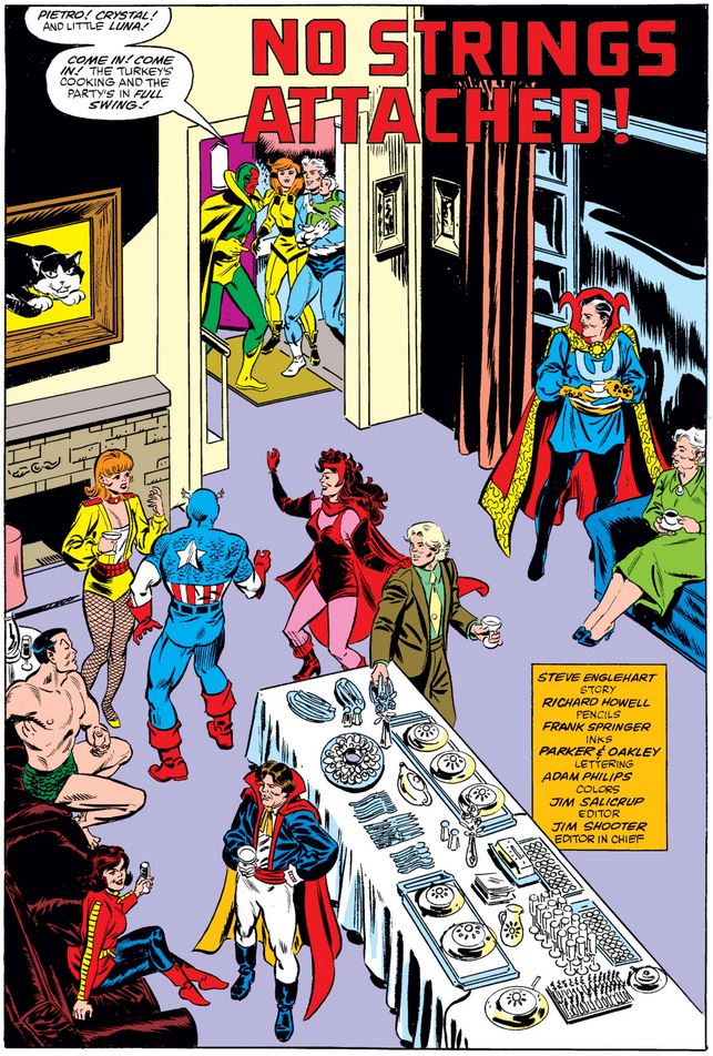 Vision and the Scarlet Witch (vol. 2) #6, March 1986: Steve Englehart (writer), Richard Howell (pencils), Frank Springer (inks), Adam Philips (colors), Rick Parker and Bill Oakley (letters). (More details at Marvel Database.)