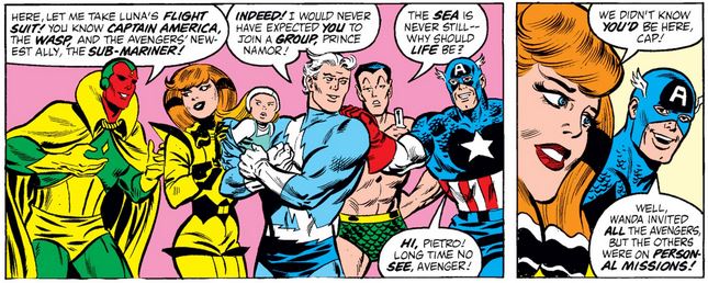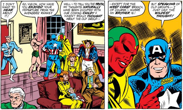 Vision mentions the child he and Wanda are expecting—they will not learn they’re actually having twins until the birth in issue #12—as well as his “brother,” Simon Williams aka Wonder Man, with whom he shares brain patterns, which leads Cap to make a completely out-of-the-blue connection (complete with a gesture that Thanos will later adopt as his trademark move, because Cap just made it look so darned cool).