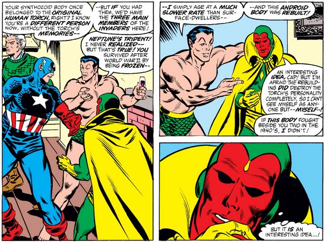 At the time, Vision was believed to be made from the original synthezoid man, Jim Hammond, aka the original Human Torch. (It’s complicated.) In the original Marvel Handbook, Hammond did not even have his own entry, despite being one of the first Timely superheroes, starring alongside Namor in Marvel Comics #1, but was relegated to Vision’s entry… even though, as we see below, Vision is quite aware that he and Hammond are not the same person.