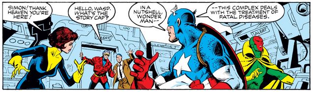 Simon succeeds, and is awarded with praise from Cap and the Wasp, before he learns that the Sandman has been saved (along with the island Manhattan, no big deal) but the cure for cancer has been lost, which he interprets in terms of his own anxieties.