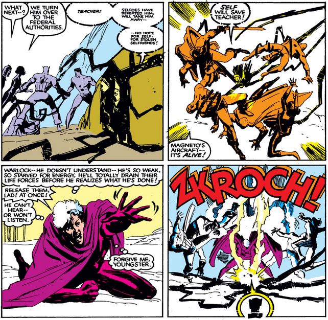 As Magneto flies to Frost’s school in a copy of the X-Men’s jet Bluebird formed by the techno-organic New Mutant named Warlock, the Avengers apprehend them and force them out of the sky, engaging with Magneto on the ground, where it takes the entire team to subdue him.