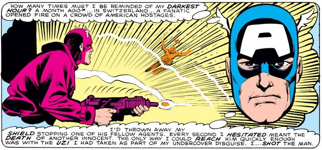 As if he needed a reason, Cap thinks back in that fateful day, including his ironclad justification, which he accepts in his head but not his heart.